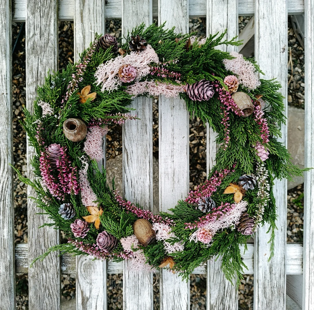- materiál: slaměný korpus, jalovec, stabilizovaný mech ve světle růžové, vřes, suché plody, šišky, bukvice