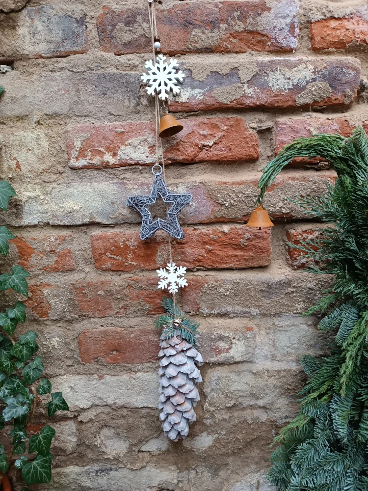 - závěs doplněný dřevěnými vločkami, proutěnou hvězdou a kovovým zvonečkem