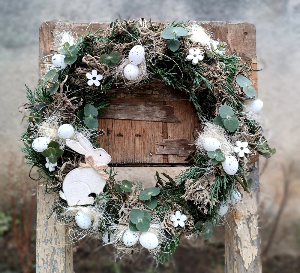 - doplněno dřevěným zajíčkem, kvítky a plastovými kropenatými vajíčky