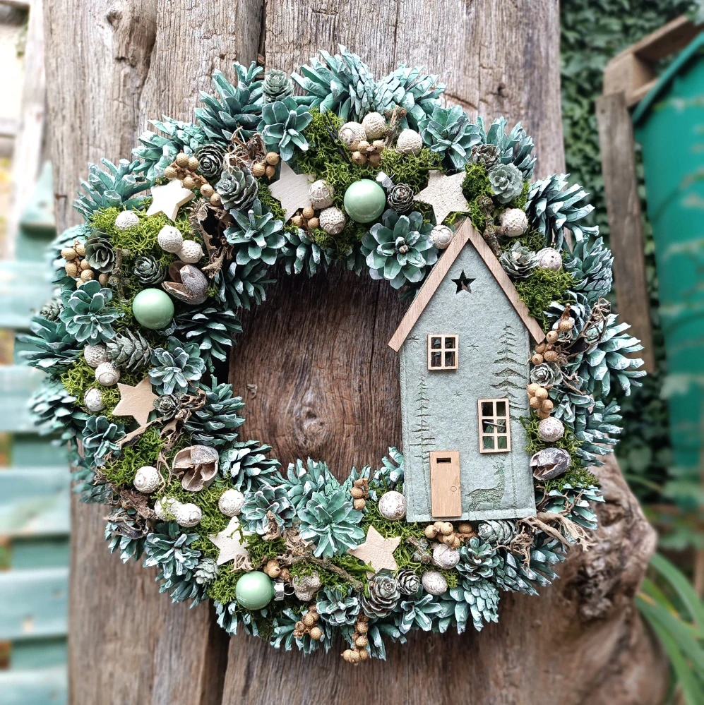 - masivní šiškový věnec, barvený do světle zelenkavé a ručně dodělané bílé okraje - imitující zasněžené stromečky