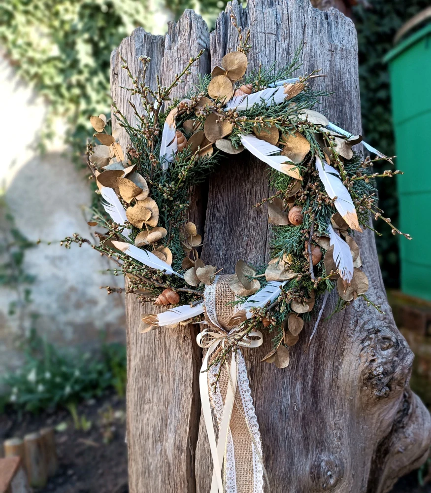 - přírodní věnec motaný z neopadavé thuje, zlatavého eukalyptu, větviček, peříček se zlatými konečky
